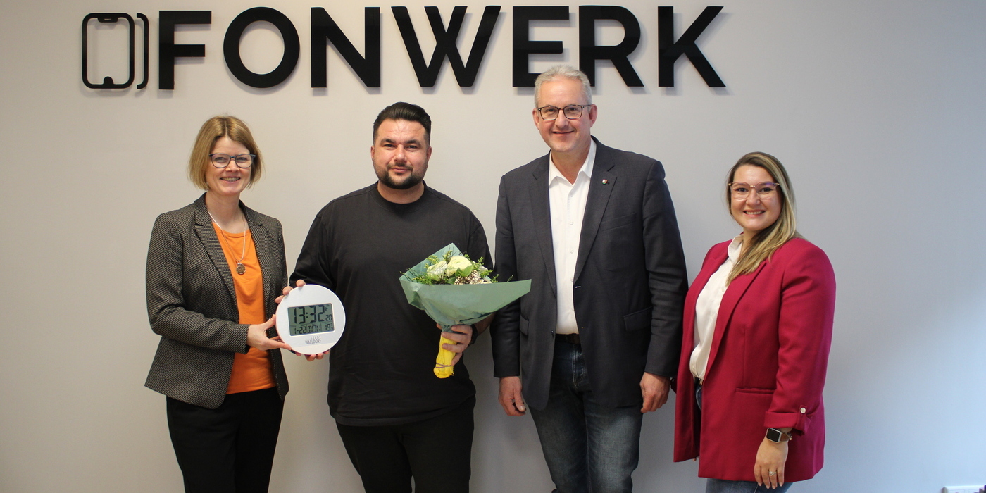 Bürgermeister Matthias Renschler (2. v. r.) begrüßte gemeinsam mit Susanne Nisius (li.) und Xenia Lux (re.) von der Wirtschaftsförderung Mustafa Gündüz (2. v. li.) vom "Fonwerk" in Walldorf. Foto: Stadt Walldorf