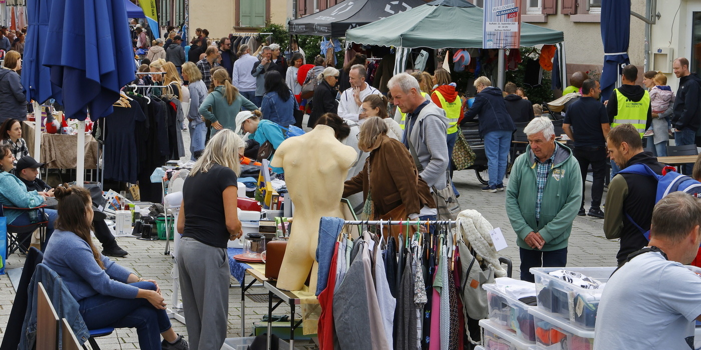„Das ist eine super Sache, das kommt sehr gut an“, freut sich Bürgermeister Matthias Renschler über den großen Andrang, der in der Hauptstraße beim ersten Flohmarkt herrscht, den der Verein Stadtmarketing mit Unterstützung der städtischen Wirtschaftsförderung ausrichtet. „Die Resonanz ist richtig gut“, stellt der Bürgermeister fest und hebt vor allem die angenehm gelöste Atmosphäre hervor: „Die Leute sind gut drauf“, das gilt gleichermaßen für Verkäuferinnen und Verkäufer wie für ihre Kundschaft, die sich längst nicht nur auf Schnäppchenjäger beschränkt. Teils wird ganz gezielt nach Nützlichem gesucht, der Preis spielt dann eher die untergeordnete Rolle. Die Auswahl ist groß, neben Kleidung sind Bücher, Spielsachen und Deko-Artikel in Sachen Häufigkeit ganz vorne dabei, teilen sich die Tische aber auch beispielsweise mit Sonnenbrillen, einem Fahrradhelm oder Schallplatten.