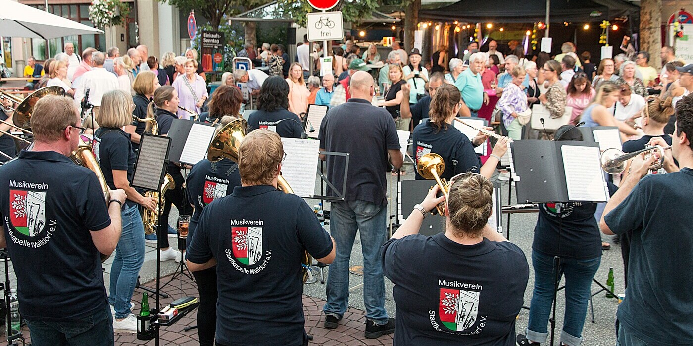 Die Walldorfer Einkaufsnacht lockte bei bestem Wetter zahlreiche Menschen in die Innenstadt, so auch beim Auftritt der Stadtkapelle. Foto: Kerstin von Splényi