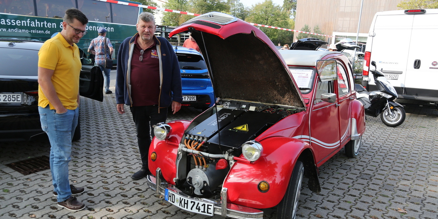 Eine ganz andere Besonderheit hat Kai Hessenmüller mitgebracht: einen auf E-Antrieb umgerüsteten Citroën 2CV, im Volksmund als „Ente“ bekannt. Wo man bei diesem Oldtimer einen knatternden Motor und einen dichte Rauchschwaden ausstoßenden Auspuff erwartet, geht es bei der E-Ente lautlos und emissionsfrei zu. „Ich habe das Auto bei einem Oldtimerhändler entdeckt und im Frühjahr gekauft“, sagt Hessenmüller, der als Mitglied der Freunde historischer Fahrzeuge Wiesloch ein Faible für alte Autos hat und auch noch einen weit älteren Oldtimer Baujahr 1961 besitzt. „Von dem abgesehen werde ich nie mehr ein Auto mit Verbrennungsmotor fahren“, hat er persönlich die Mobilitätswende weitgehend vollzogen und ist seit acht Jahren auch mit dem Familienauto elektrisch unterwegs. Die Ente, original mit 28 PS, sei von einem Getränkekonzern als erster Preis in einem Wettbewerb in Sachen Nachhaltigkeit umgerüstet worden. „Sie fährt sich sehr schön“, sagt Hessenmüller.