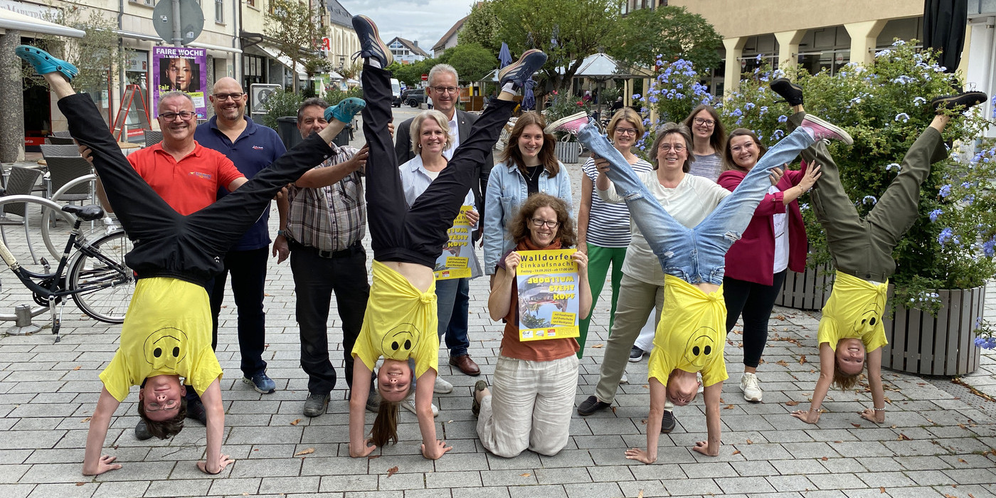 „Unsere Innenstadt zeigt sich von ihrer besten, buntesten und lebendigsten Seite“, freut sich Bürgermeister Matthias Renschler auf die Walldorfer Einkaufsnacht, die er am Freitag, 19. September, um 17 Uhr auf dem Marktplatz offiziell eröffnet. Unterstützt wird er von Artistinnen und Artisten des Zirkus Payaso aus der Turnabteilung der SG Walldorf Astoria. Die teilnehmenden Geschäfte erwarten ihre Gäste an diesem Abend bis 22 Uhr unter dem Motto „Walldorf steht Kopf“. „Mit vielen kreativen Aktionen laden die Einzelhändler und Institutionen ihre Kundinnen und Kunden zu einem tollen Bummel durch Walldorfs kopfstehende Einkaufsmeile ein“, sagt Andreas Schuppe, der Vorsitzende des Gewerbevereins, der die Veranstaltung mit Unterstützung der städtischen Wirtschaftsförderung organisiert. Ein buntes Rahmenprogramm bietet zusätzliche Unterhaltung.