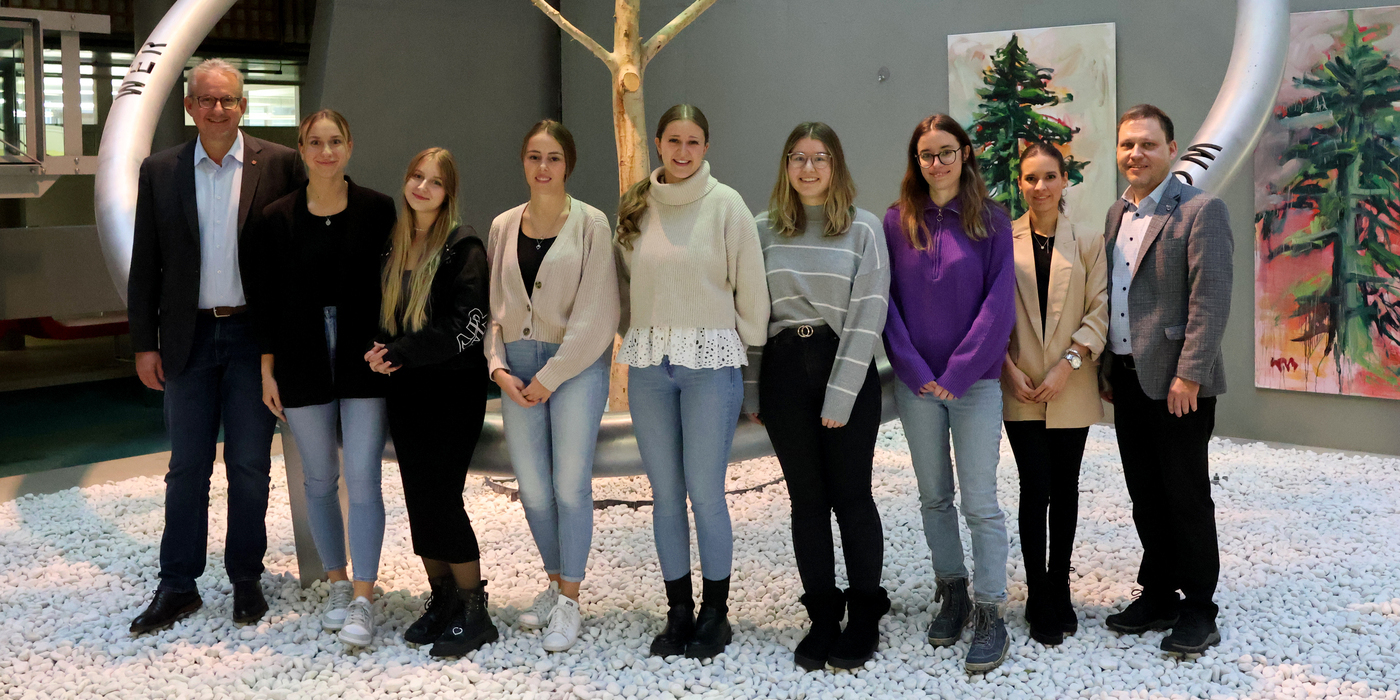 Die Stadt gratulierte ihren Auszubildenden für hervorragende schulische Leistungen: (v.li.) Bürgermeister Matthias Renschler, Eva Werner, Angelina Salmon, Charlotte Gauch, Melissa Beck, Madeleine Engels und Marie Bernhard sowie aus dem Fachdienst Personalwesen Nina Hack und Stefan Pahlen.