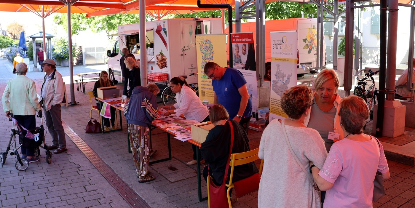 Im Rahmen der Woche der Demenz (16. bis 22. September) machten die IAV-Stelle der Stadt Walldorf, das Gerontopsychiatrische Zentrum am PZN und der Pflegestützpunkt des Rhein-Neckar-Kreises mit ihren Angeboten auf dem Marktplatz auf das Thema Demenz aufmerksam.