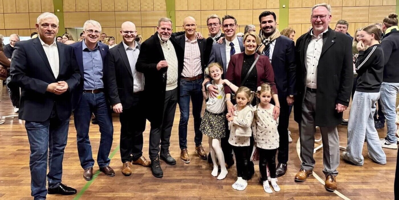 Der wiedergewählte Bürgermeister von Nußloch Joachim Förster (4.v.r.) mit seiner Frau Adriana