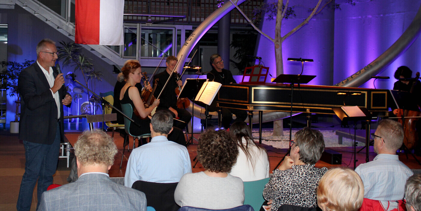 Nach dem erfolgreichen „Musiktage Talk“ mit Marcus Imbsweiler und Timo Jouko Herrmann startete das Festival nun auch musikalisch. Vor dem Rathaus war wieder der rote Teppich ausgerollt und das Verwaltungsgebäude verwandelte sich in einen stimmungsvollen Konzertsaal, ganz in blau-violettes Licht getaucht. Der städtische Musikbeauftragte Herrmann, Initiator und künstlerischer Leiter der Musiktage, hat zum zweiten Mal sein Lieblingsthema „Salieri“ als Motto gewählt. Ihm ist es ein Anliegen, Antonio Salieri (1750-1825) ins rechte Licht zu rücken, mit vielen falschen Gerüchten und bösartigen Verleumdungen aufzuräumen und „Dichtung“ von „Wahrheit“ zu trennen.