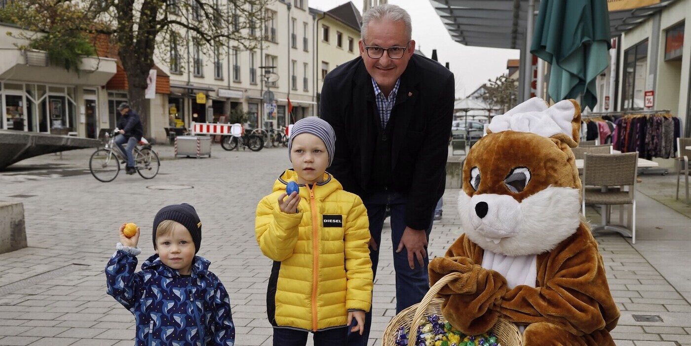 Bürgermeister Matthias Renschler und der Osterhase haben in einer Aktion des Gewerbevereins am Ostersamstag kleine Geschenke in der Hauptstraße verteilt.