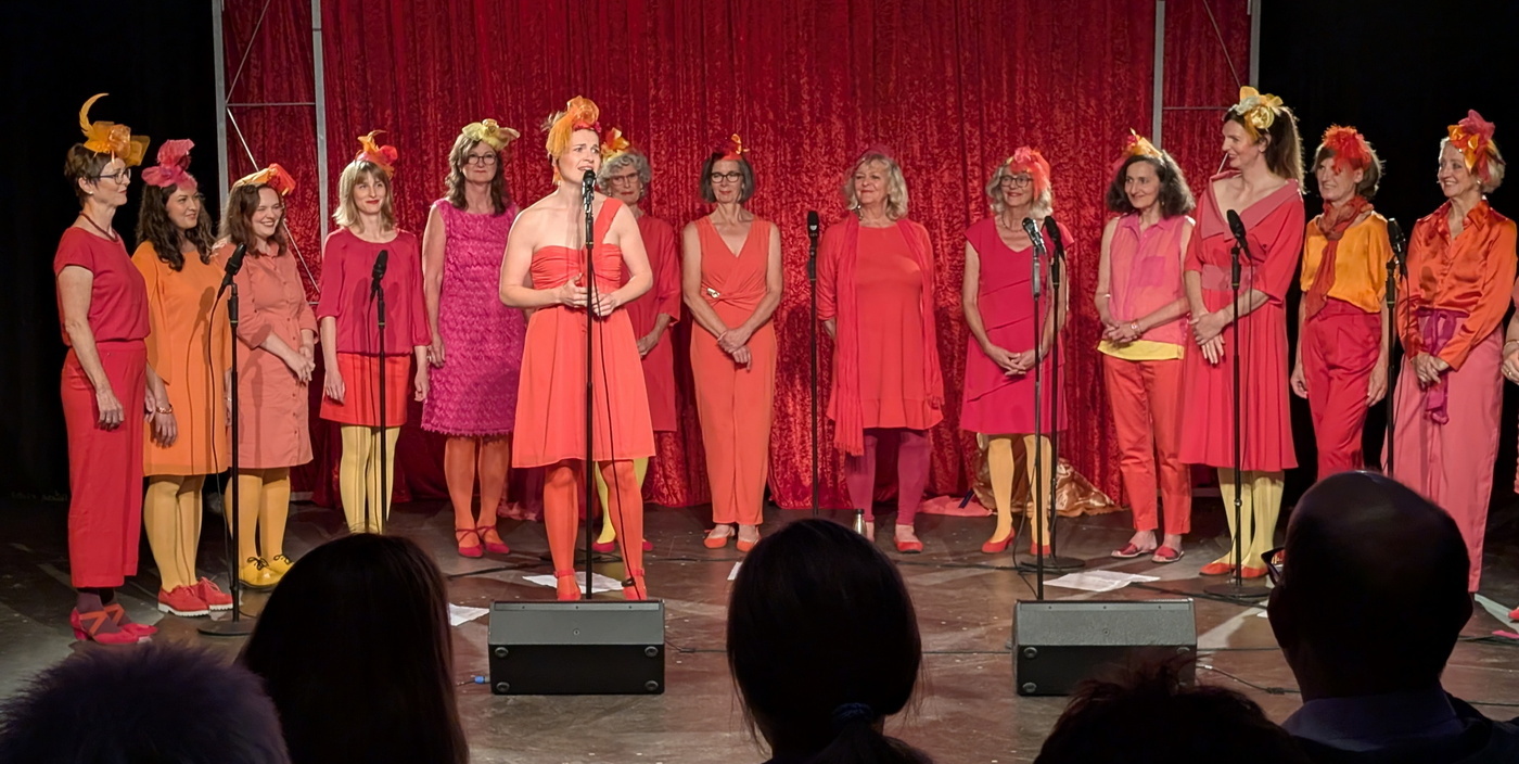 Der Frauenchor beweist indes, wie vielseitig, humorvoll und unterhaltsam er ist. Ob bekannte Melodien, die mit eigenen Texten versehen sind – deutsch, englisch oder sogar in Mundart –, die 15 Damen wissen ihr Publikum zu begeistern. Im Halbrund haben sie sich um ihre Chorleiterin aufgereiht, sortiert nach Alt, Tenor, Bass und Sopran. Die Reihenfolge ist jedoch nicht fest, sondern ändert sich von Lied zu Lied. Auch die Rotationen werden stellenweise auf die Schippe genommen.