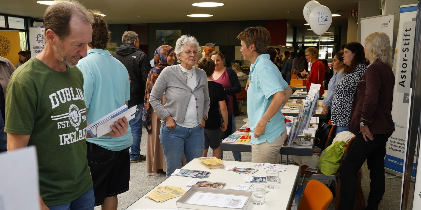 An zahlreichen Ständen informierten die verschiedenen Anbieter über ihre Dienste. „Wir bieten kostenlose Fortbildungen an“, sagte etwa Eva Maderas, Koordinatorin des Geriatrischen Schwerpunktes an der GRN-Klinik Schwetzingen. Der Schwerpunkt der Fortbildungen liege auf dem Thema Demenz. Einen besonderen Kurs für Bewohner mit Demenz stellte Caroline Günther von der Betreuung des Pflegezentrums Astor-Stift vor: „Es werden verschiedene Übungen mit Gegenständen gemacht – zum Beispiel mit Igelbällen oder Korken. Damit begeben sich die Teilnehmenden auf eine Fantasiereise. Die Gegenstände helfen dabei, die Vorstellung mit Haptik fühlbar zu machen. Jede Einheit dauert 45 Minuten und wird einmal wöchentlich, in Ergänzung mit einer Gymnastikeinheit, angeboten.“ Entwickelt wurde das Konzept vom Karlsruher Institut für Technologie (KIT) und wird seit 2019 vom InCoPE, einem Projekt des Instituts für Sport und Sportwissenschaft am KIT, verantwortet.