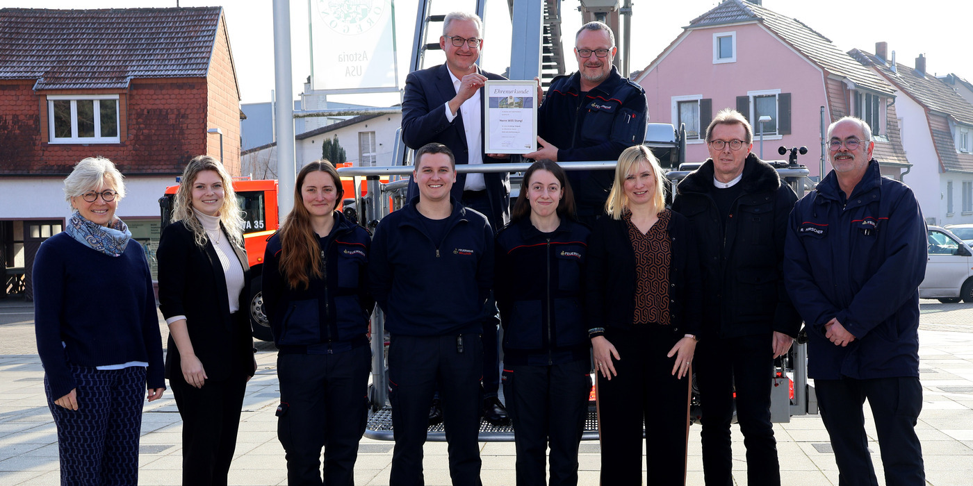 Bürgermeister Matthias Renschler überreicht Willi Stangl die Urkunde zum Jubiläum (hinten v.li.). Dazu gratulieren (vorne v.li.) Annette Eckert, Alena Müller, Tanja Schlarb, Markus Schall, Laura Stangl, Tanja Stefanik, Erster Beigeordneter Otto Steinmann und Ralf Hirscher (stellvertretender Kommandant der Feuerwehr). Foto: Stadt Walldorf