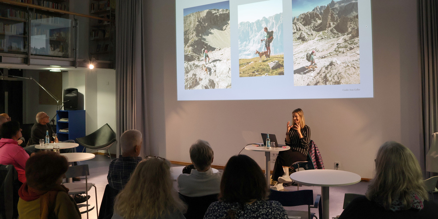 Zunächst stellt sich die Autorin und Reisejournalistin vor und spricht darüber, wie Ralfi in ihr Leben getreten ist: über ein Tierheim in Portugal. Der Portugiesische Podengo sei zuvor aus einer Tötungsstation gerettet worden. Damals, mit rund zehn Monaten, habe sie ihn adoptiert und nach Deutschland überführt. „Er ist eine witzige Mischung aus ängstlich und selbstbewusst“, charakterisiert ihn Nadine Regel lachend. Und er sei ein Rockstar, denn er klettere gerne – worauf später noch näher eingegangen wird. Das „Wohoo“ sei sein Erkennungsmerkmal, ein Laut, den Ralfi von sich gebe, wenn er überrascht oder aufgeregt sei. Zum Beispiel, wenn er einem Murmeltier begegne – was in den Alpen nicht unüblich sei.