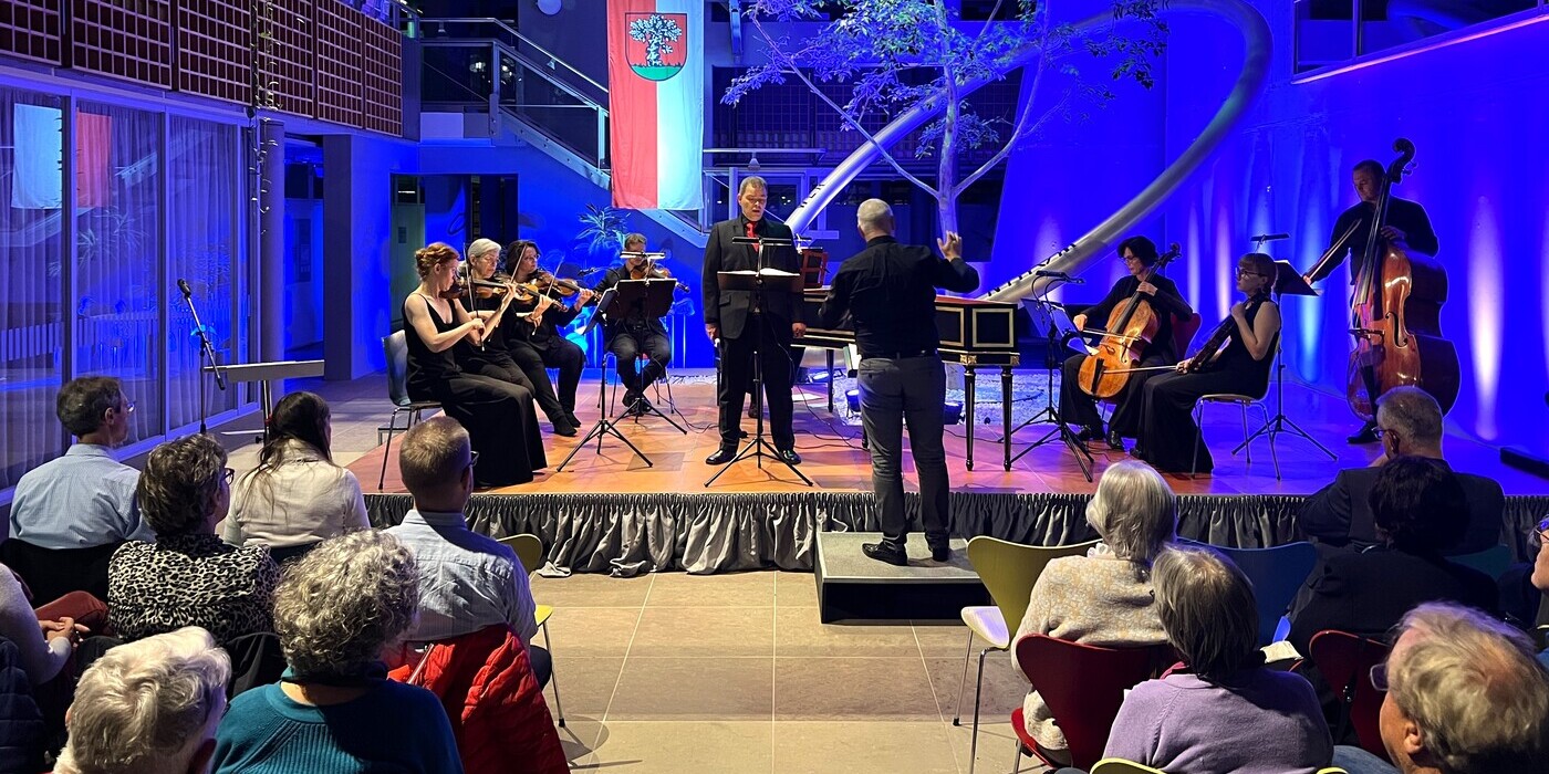 Sänger Matthias Lucht und das Ensemble Operino unter der Leitung von Musiktage-Chef Timo Jouko Herrmann begeistern das Publikum im Rathaus-Foyer mit „Musikschätzen aus der Wiener Hofkapelle“. Foto: Stadt Walldorf