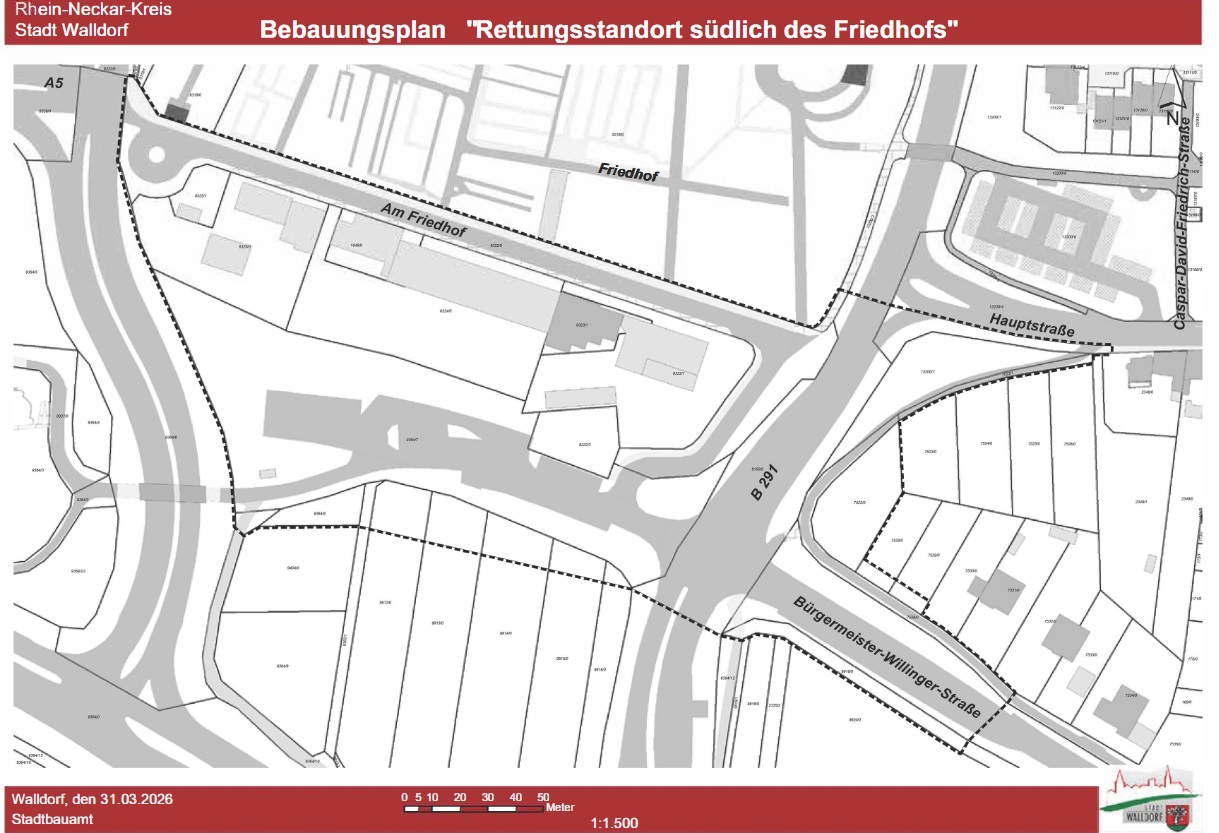 Damit einhergehend hat sich das Ziel, der Zweck und der Geltungsbereich des in Aufstellung befindlichen Bebauungsplan „Südlich des Friedhofs“ maßgeblich geändert. Vor diesem Hintergrund beschloss der Gemeinderat der Stadt Walldorf in seiner öffentlichen Sitzung am 21.04.2026 die Aufhebung des Aufstellungsbeschlusses zum Bebauungsplan „Südlich des Friedhofs“ und die Aufstellung des Bebauungsplans „Rettungsstandort südlich des Friedhofs“.